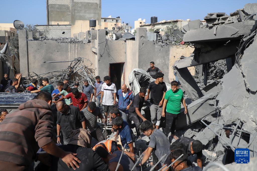 11月3日,在加沙地帶南部城市汗尤尼斯,人們在遭襲擊后的建筑廢墟上實(shí)施救援。