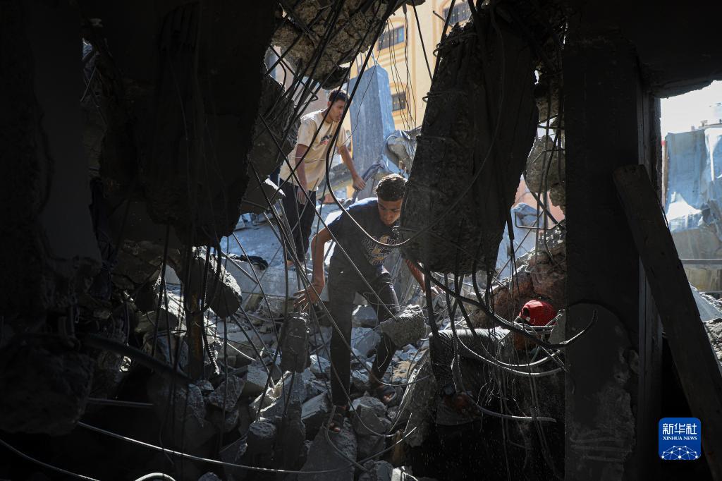 11月3日,在加沙地帶南部城市汗尤尼斯,人們在遭襲擊后的建筑廢墟上實(shí)施救援。