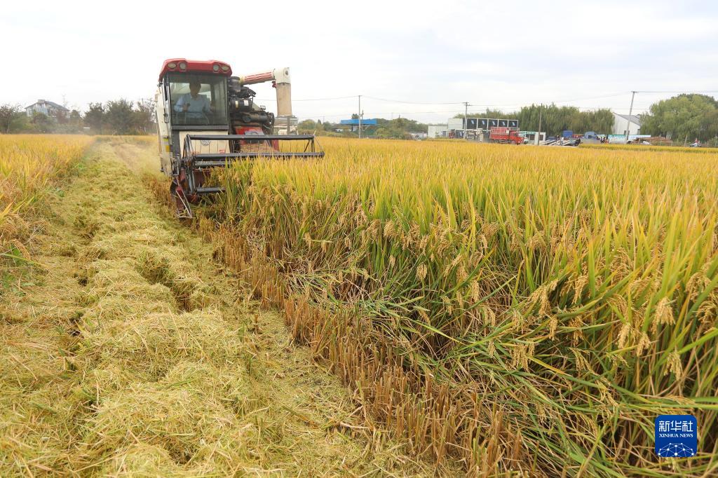 11月4日,在浙江省嘉興市南湖區鳳橋鎮永紅村,農機手駕駛收割機收割水稻。