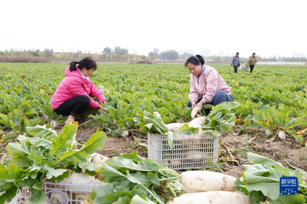 11月3日,河北省邢臺市襄都區泉東街道辦事處白塔社區農民在田間采收蘿卜。