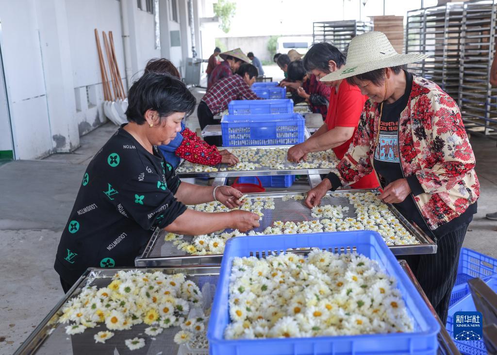 11月4日,在三村村一家現代農業(yè)企業(yè)內,村民在分揀剛剛采摘的杭白菊。
