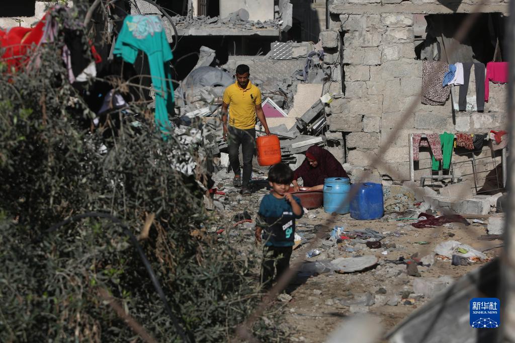 11月4日,在加沙地帶南部城市拉法,居民在遭以色列襲擊損毀的建筑廢墟中洗衣服。