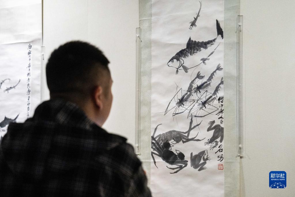 11月5日,在湘潭市博物館,觀(guān)眾在觀(guān)看齊白石作品《蝦蟹圖》。
