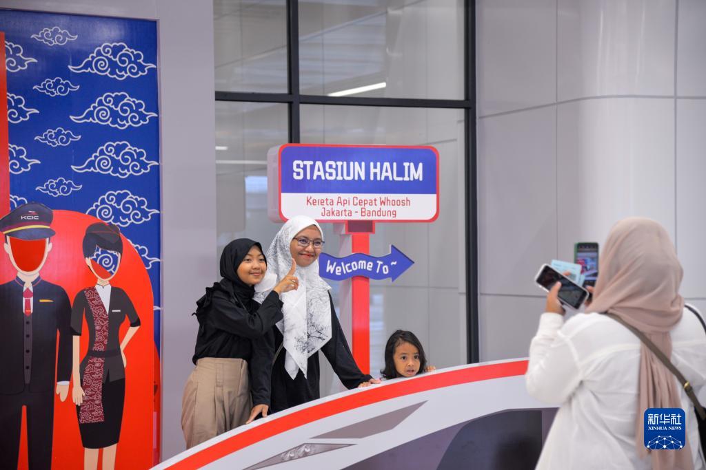 11月5日,在印度尼西亞雅加達哈利姆站,人們在一處“打卡處”拍照。