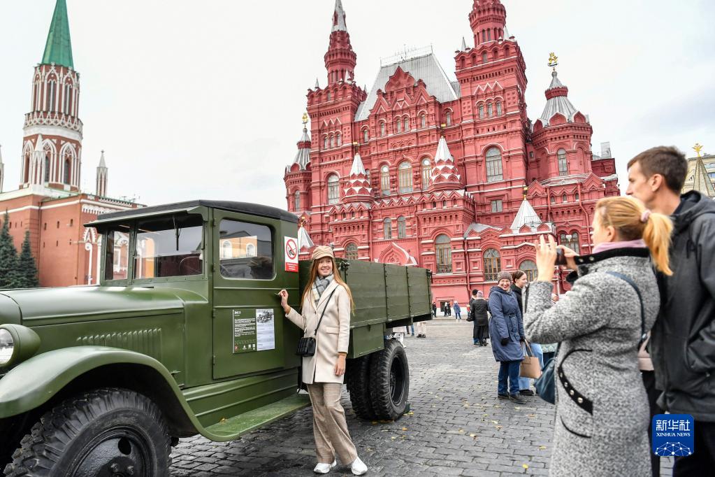 11月5日,在俄羅斯首都莫斯科,人們在以紀念1941年蘇聯(lián)紅場(chǎng)閱兵式為主題的露天展覽上拍照。