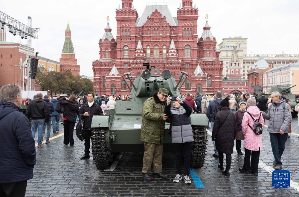 11月5日,在俄羅斯首都莫斯科,人們在以紀念1941年蘇聯(lián)紅場(chǎng)閱兵式為主題的露天展覽上拍照。