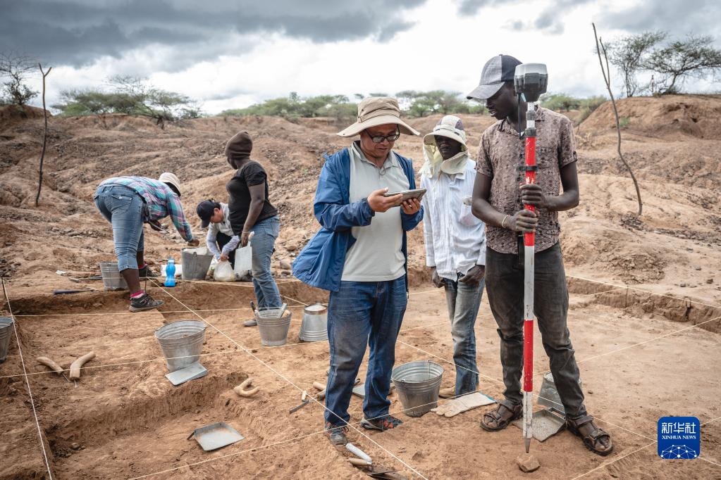 11月3日,中肯聯(lián)合考古隊隊員顧雪軍(右三)在位于肯尼亞巴林戈郡馬里加特鎮的考古現場(chǎng)測量石器坐標位置。