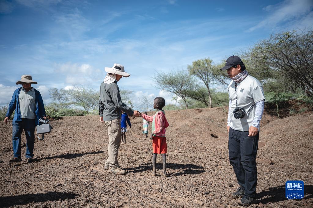 11月4日,中肯聯(lián)合考古隊中方現場(chǎng)負責人趙清坡(左二)在位于肯尼亞巴林戈郡馬里加特鎮的考古現場(chǎng)周邊區域進(jìn)行野外調查時(shí)與當地兒童交流。