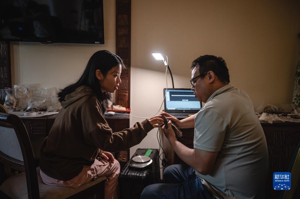 11月3日,中肯聯(lián)合考古隊隊員彭勝藍(左)與顧雪軍在位于肯尼亞巴林戈郡馬里加特鎮的臨時(shí)駐地內進(jìn)行交流。