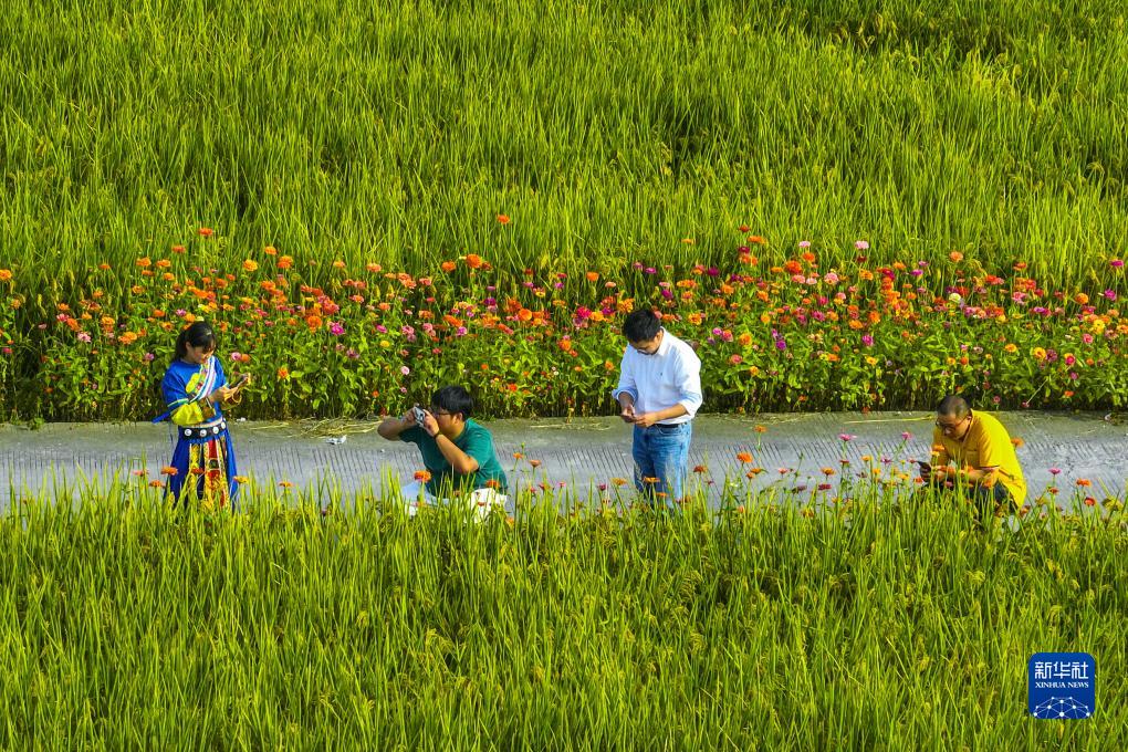 11月4日,在浙江省余姚市三七市鎮魏家橋村,游客在稻田邊游玩拍照(無(wú)人機照片)。