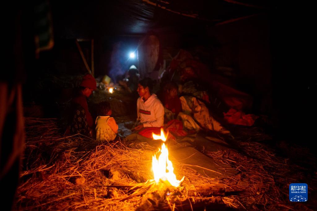 11月5日,人們在尼泊爾西部扎澤爾果德地震災區的火堆旁取暖。