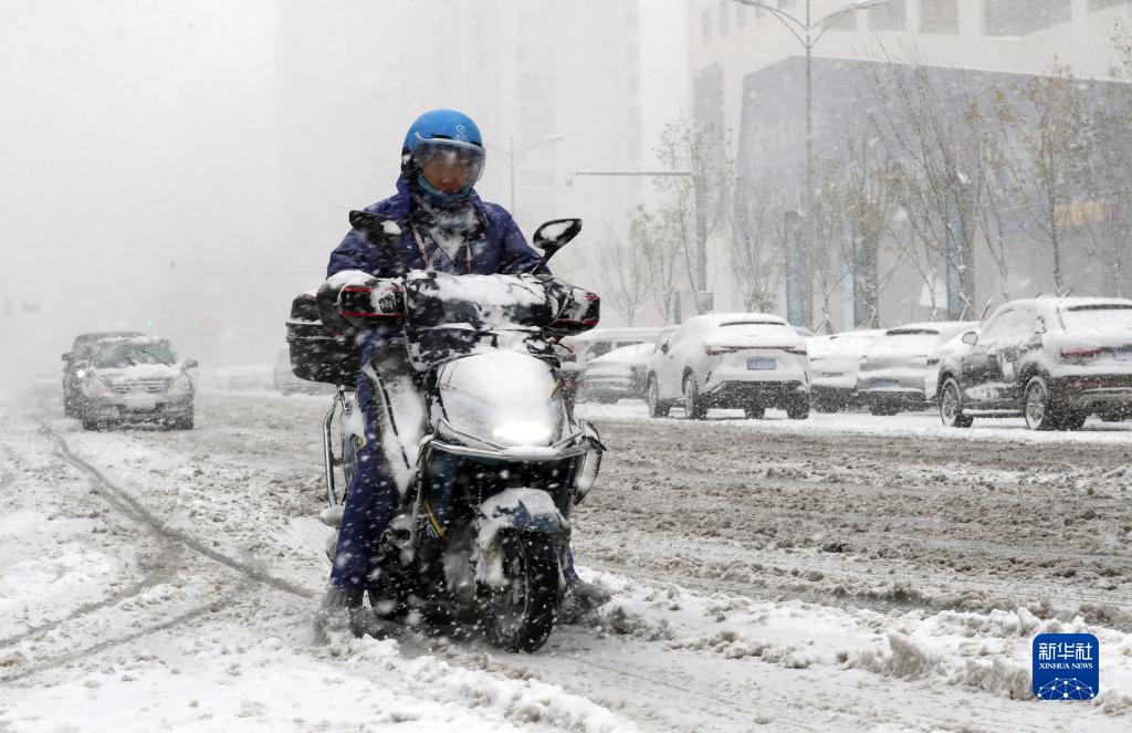 11月6日,在沈陽(yáng)市渾南區,一位外賣(mài)員在雪中送外賣(mài)。