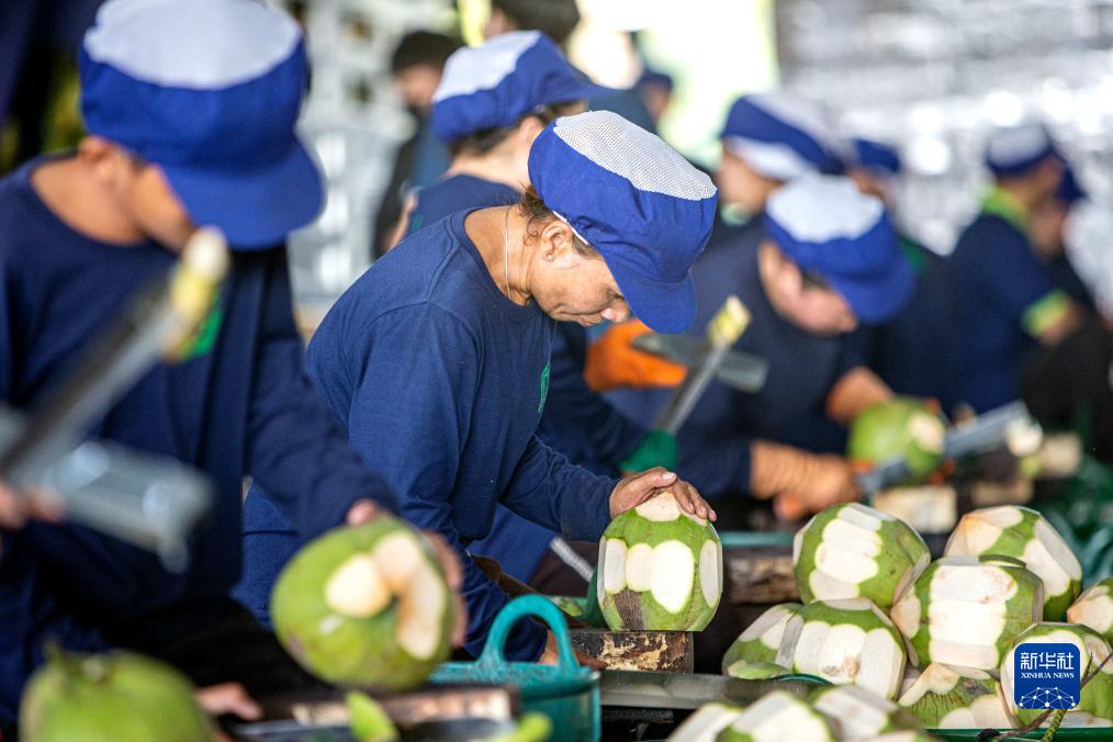11月3日,工人在泰國叻武里府丹嫩沙多的椰子工廠(chǎng)切割椰子。