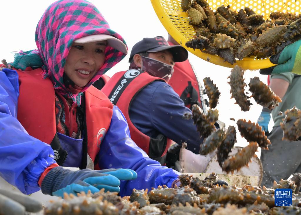 11月6日,河北省唐山市曹妃甸區一家深海網(wǎng)箱海參養殖合作社的社員在分揀剛捕撈的海參。