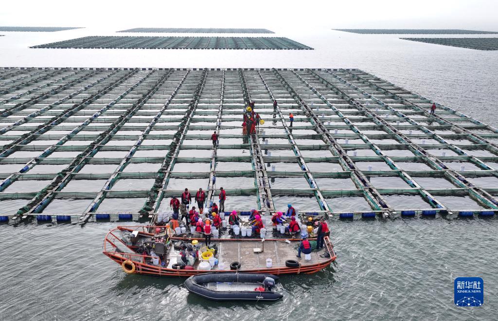 11月6日,河北省唐山市曹妃甸區一家深海網(wǎng)箱海參養殖合作社的社員在捕撈、分揀海參(無(wú)人機照片)。