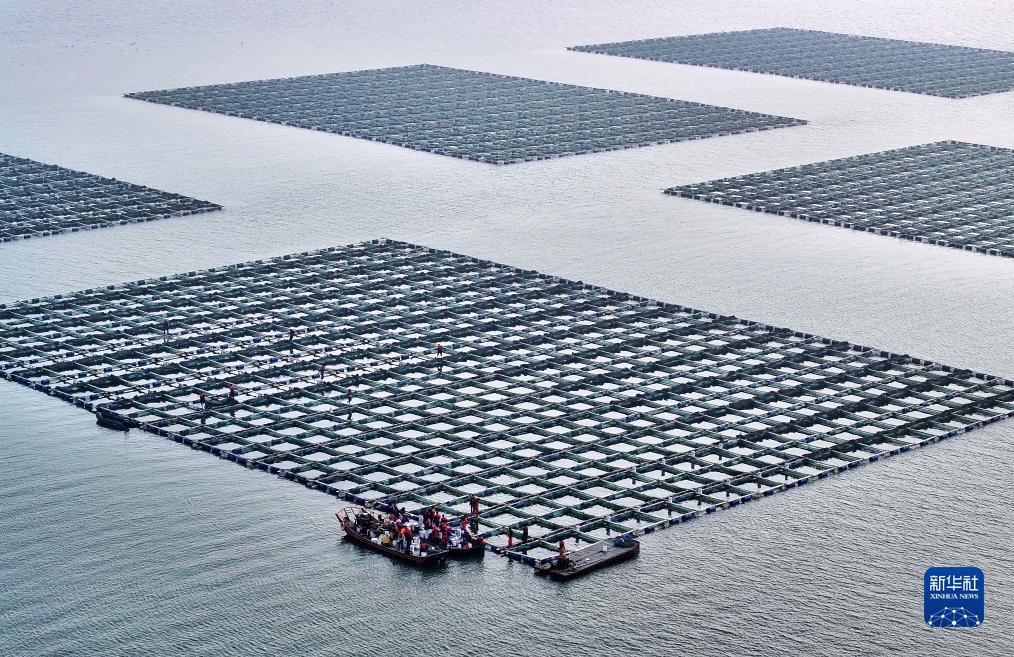 11月6日,河北省唐山市曹妃甸區一家深海網(wǎng)箱海參養殖合作社的社員在捕撈海參(無(wú)人機照片)。
