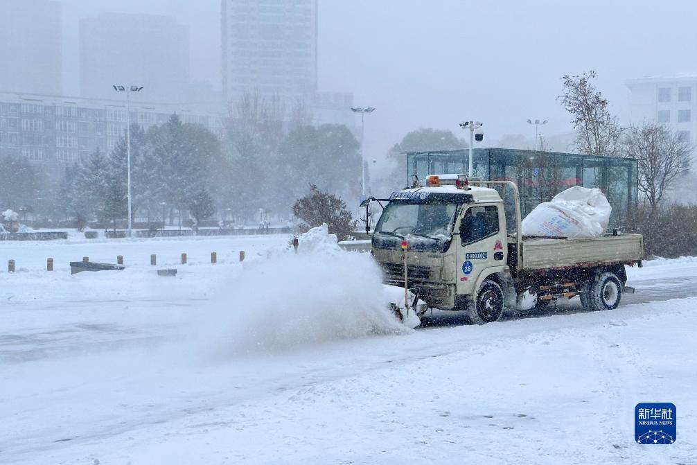 11月6日,在黑龍江省佳木斯市,清雪車(chē)在佳木斯站前清理積雪。