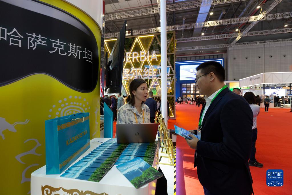 11月6日,在第六屆進(jìn)博會(huì )國家展哈薩克斯坦展臺,哈薩克斯坦國家旅游公司工作人員和觀(guān)眾交流。