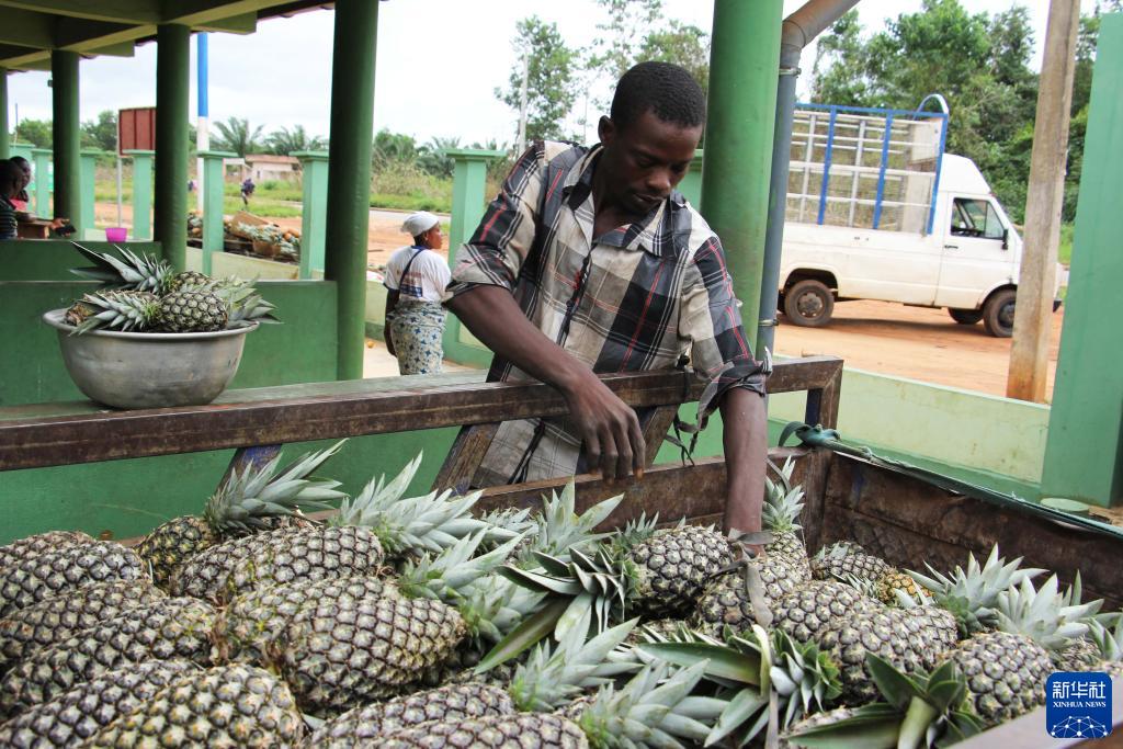 10月23日,一名男子在貝寧“甜面包”菠蘿主產(chǎn)區阿拉達的一處菠蘿收購點(diǎn)卸下菠蘿。