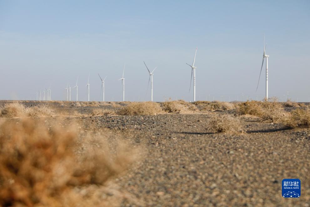 這是11月7日在甘肅省酒泉市瓜州縣泰源橋南第三風(fēng)電場(chǎng)拍攝的風(fēng)力發(fā)電機組。