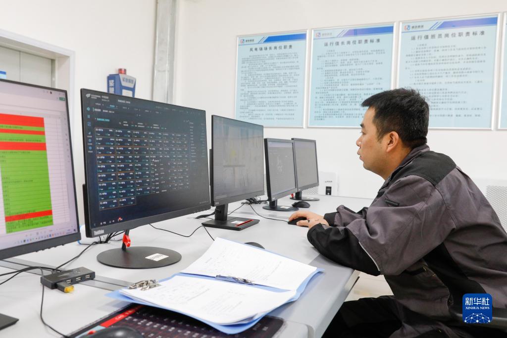 11月7日,在甘肅省酒泉市瓜州縣泰源橋南第三風(fēng)電場(chǎng),工作人員在中控室監測風(fēng)電場(chǎng)運行情況。