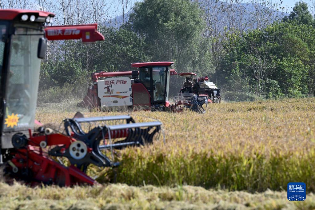 11月7日,在安徽省蕪湖市繁昌區荻港鎮,村民駕駛收割機收割水稻。