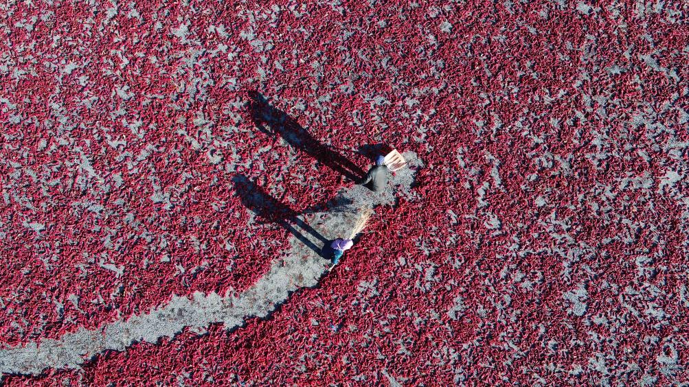 11月7日,甘肅省定西市安定區鳳翔鎮李家咀村的農民在晾曬辣椒(無(wú)人機照片)。