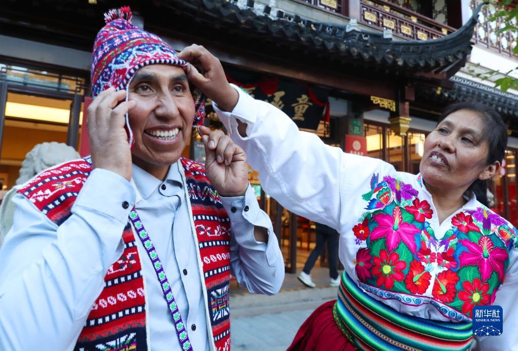 馬馬尼大叔游覽上海豫園時(shí)演示如何佩戴傳統秘魯針織小帽(11月2日攝)。