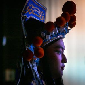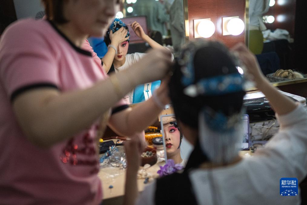 暮色漸起,在湖北戲曲藝術(shù)中心(首義劇場(chǎng))的后臺,即將演出的年輕演員們或涂抹油彩、勾畫(huà)眉目,或梳理髯口、佩戴釵環(huán),或開(kāi)嗓練聲、熟悉走位,繁忙而有序。