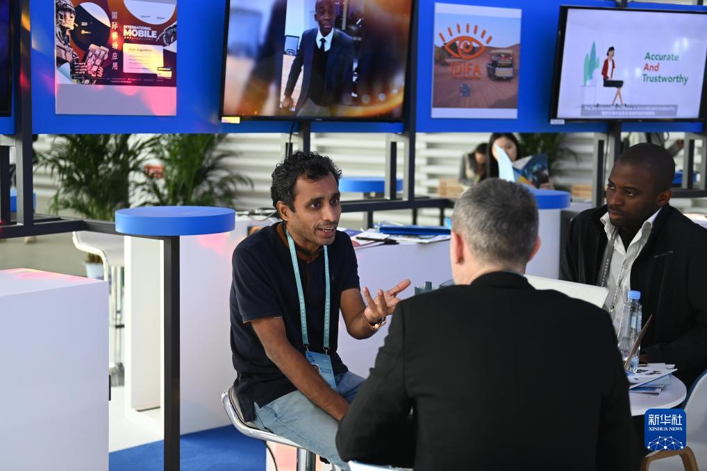 11月7日,“互聯(lián)網(wǎng)之光”博覽會(huì )境外展區的參展商代表在洽談區交流。