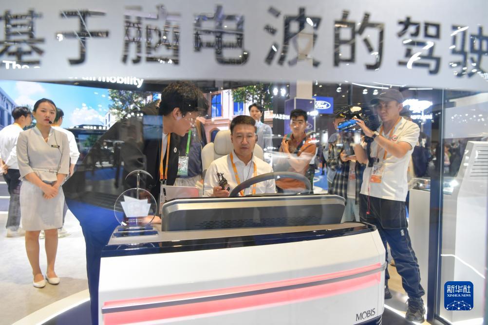 11月6日,參觀(guān)者在第六屆進(jìn)博會(huì )汽車(chē)展區摩比斯展臺體驗基于腦電波的駕駛員狀態(tài)監測系統M.Brain2.0。