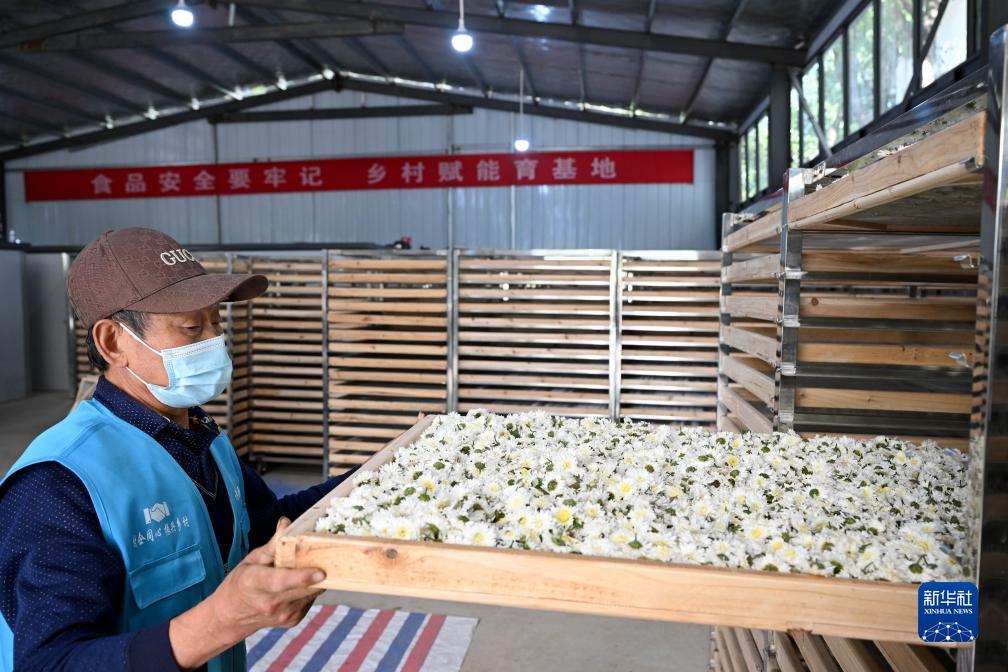 11月7日,在安徽省蕪湖市繁昌區峨山鎮東島村,村民將分揀后的貢菊放入烘烤架烘干。