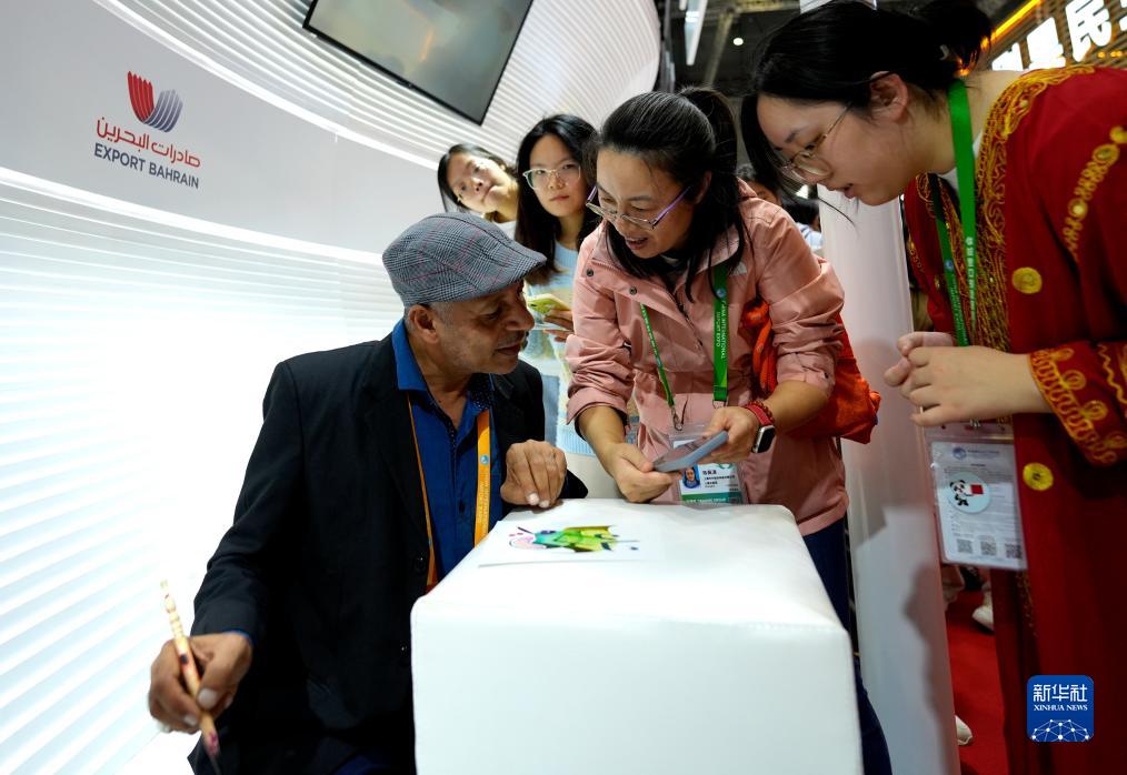 11月7日,在第六屆進(jìn)博會(huì )國家展區,巴林王國展臺一位藝術(shù)家與觀(guān)眾互動(dòng)交流。