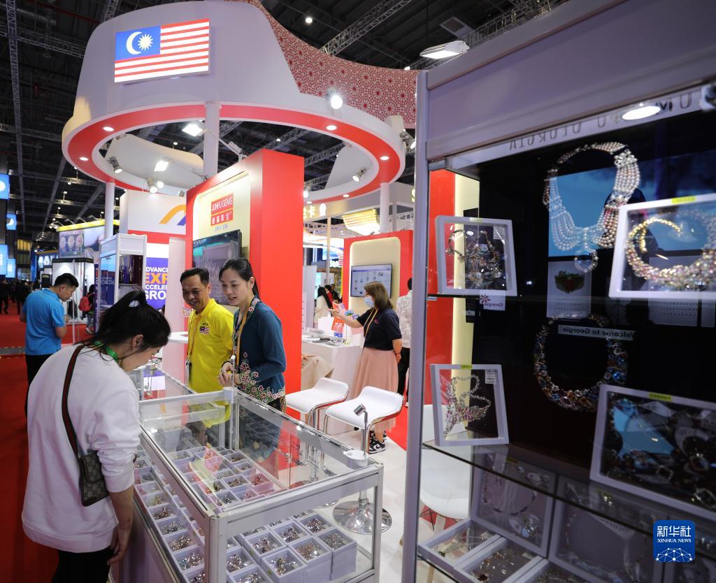 11月6日,參觀(guān)者在第六屆進(jìn)博會(huì )國家展馬來(lái)西亞展臺欣賞展出的珠寶首飾。