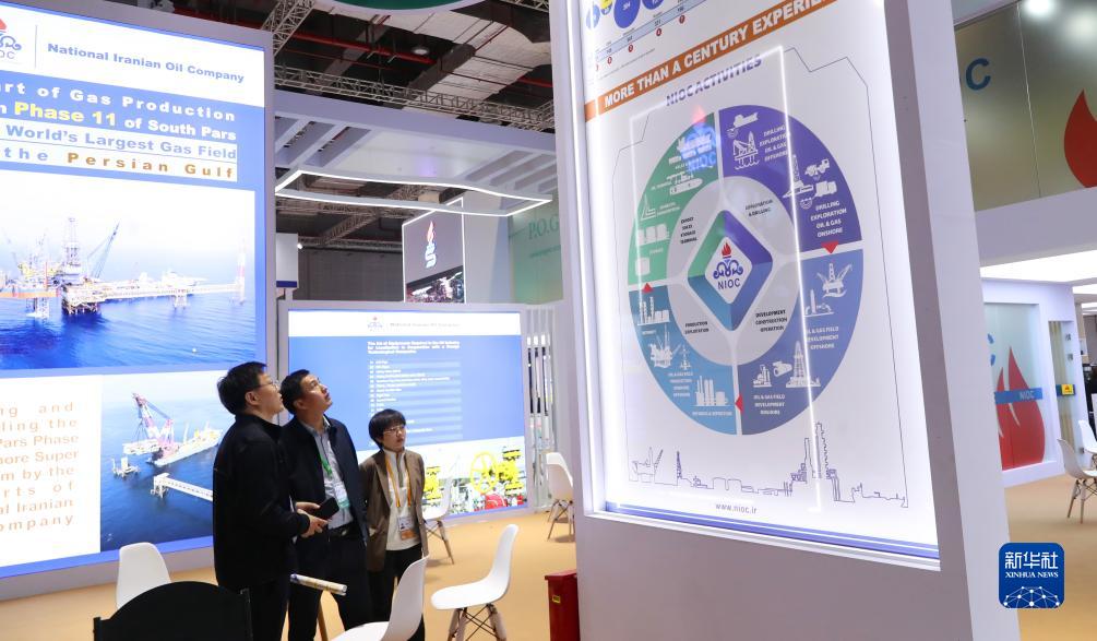 11月7日,參觀(guān)者在第六屆進(jìn)博會(huì )技術(shù)裝備展區的伊朗石油化學(xué)和工業(yè)公司展臺邊駐足觀(guān)看。