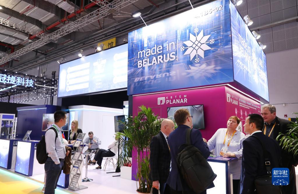 11月7日,參觀(guān)者在第六屆進(jìn)博會(huì )技術(shù)裝備展區的白俄羅斯企業(yè)聯(lián)合展臺與展方工作人員交流。