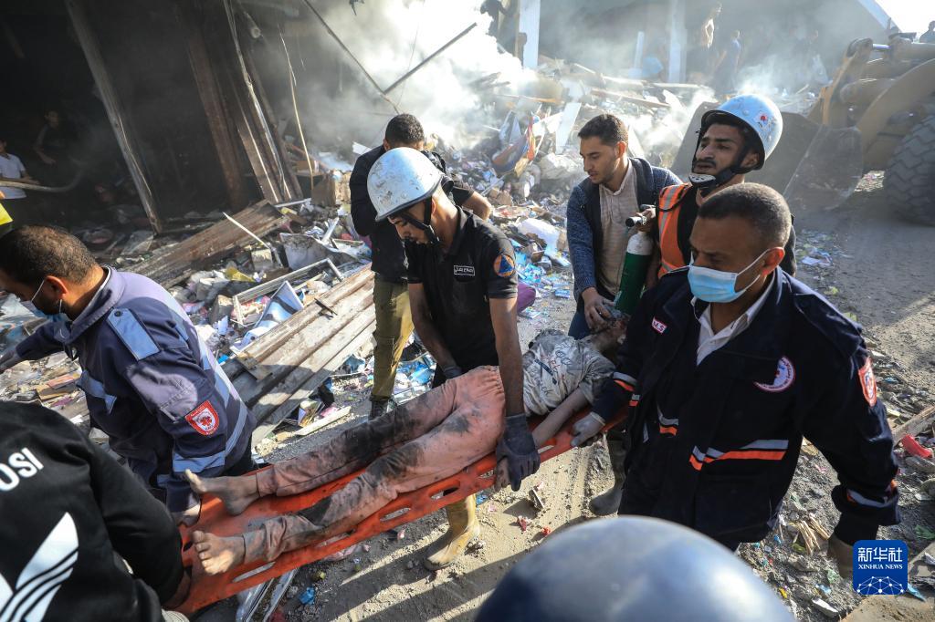 11月7日,在加沙地帶南部城市汗尤尼斯,人們在遭到以色列襲擊的建筑廢墟上實(shí)施救援。