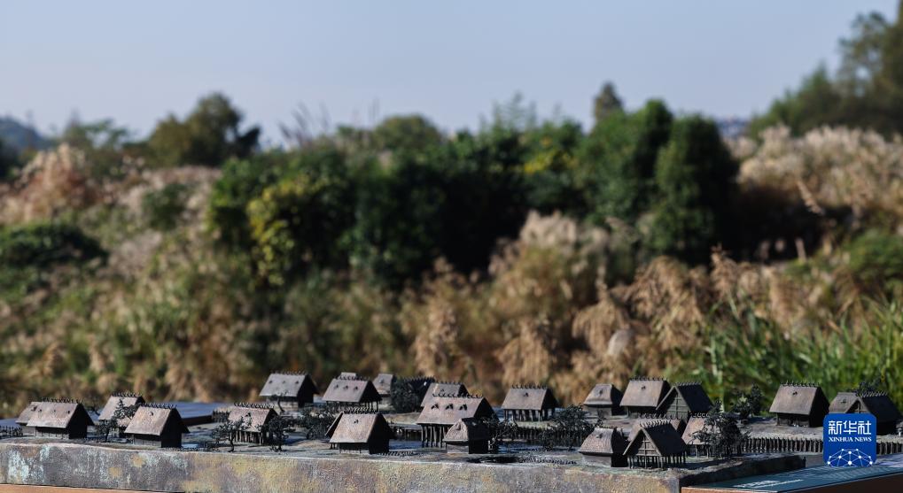 11月7日拍攝的良渚古城遺址公園鐘家港古河道旁的良渚先民夾河而居的模型展示區。
