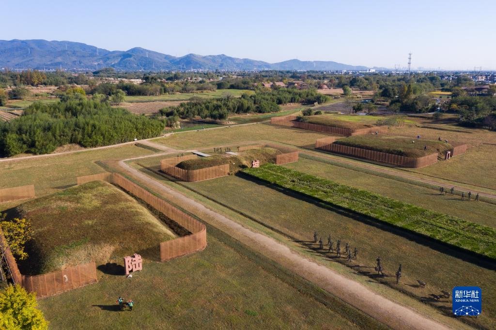 11月7日拍攝的良渚古城遺址公園中的陸城門(mén)遺址(無(wú)人機照片)。