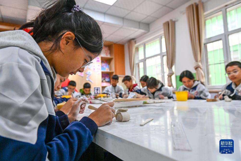 在新疆阿克陶縣雪松中學(xué),“紅杜鵑”陶藝社團的學(xué)生在體驗陶藝制作(11月7日攝)。
