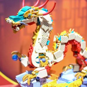 11月6日在第六屆進(jìn)博會(huì )消費品展區樂(lè )高集團展臺拍攝的首次亮相的春節祥龍納福玩具套裝。