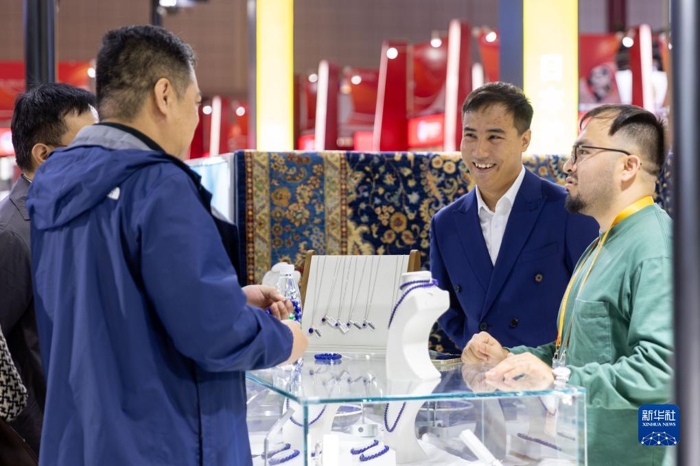 11月6日,阿里(右二)和同事在第六屆進(jìn)博會(huì )消費品展區向參展人員介紹阿富汗青金石飾品。