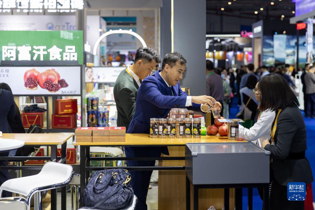 11月6日,阿里(中)在第六屆進(jìn)博會(huì )食品及農產(chǎn)品展區為參展人員準備試吃的阿富汗松子。