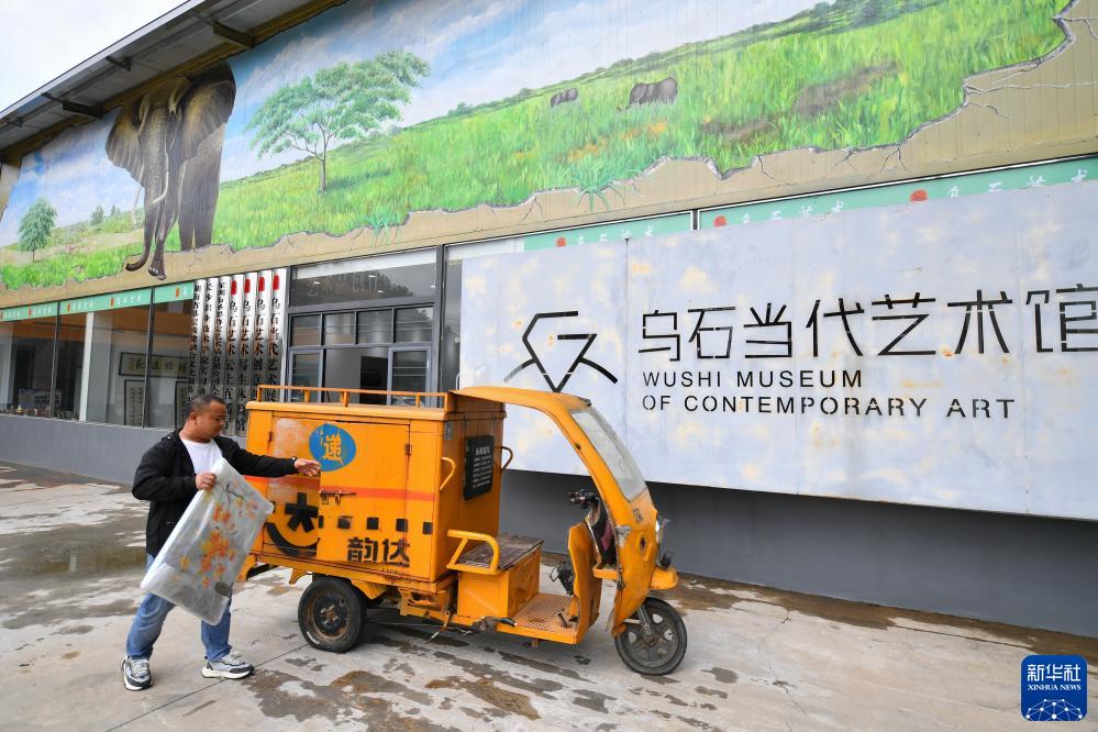 11月8日,在湖南省瀏陽(yáng)市小河鄉烏石村的烏石當代藝術(shù)館,快遞員準備將油畫(huà)放置到快遞車(chē)上。