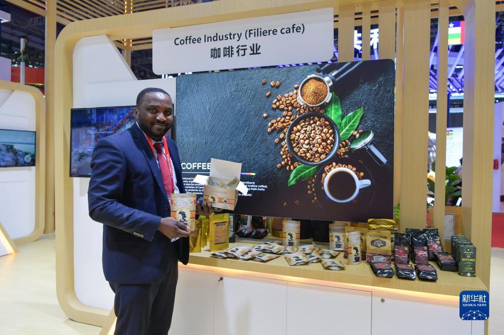 11月8日,在第六屆進(jìn)博會(huì )國家展剛果民主共和國館,展商展示產(chǎn)自金沙薩的咖啡產(chǎn)品。
