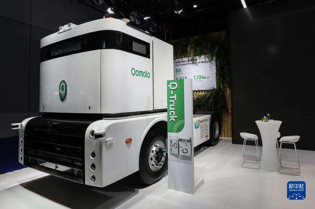 11月8日在第六屆進(jìn)博會(huì )汽車(chē)展區拍攝的西井科技Q-Truck全時(shí)無(wú)人駕駛新能源商用車(chē)。這是西井科技首次參加進(jìn)博會(huì )。