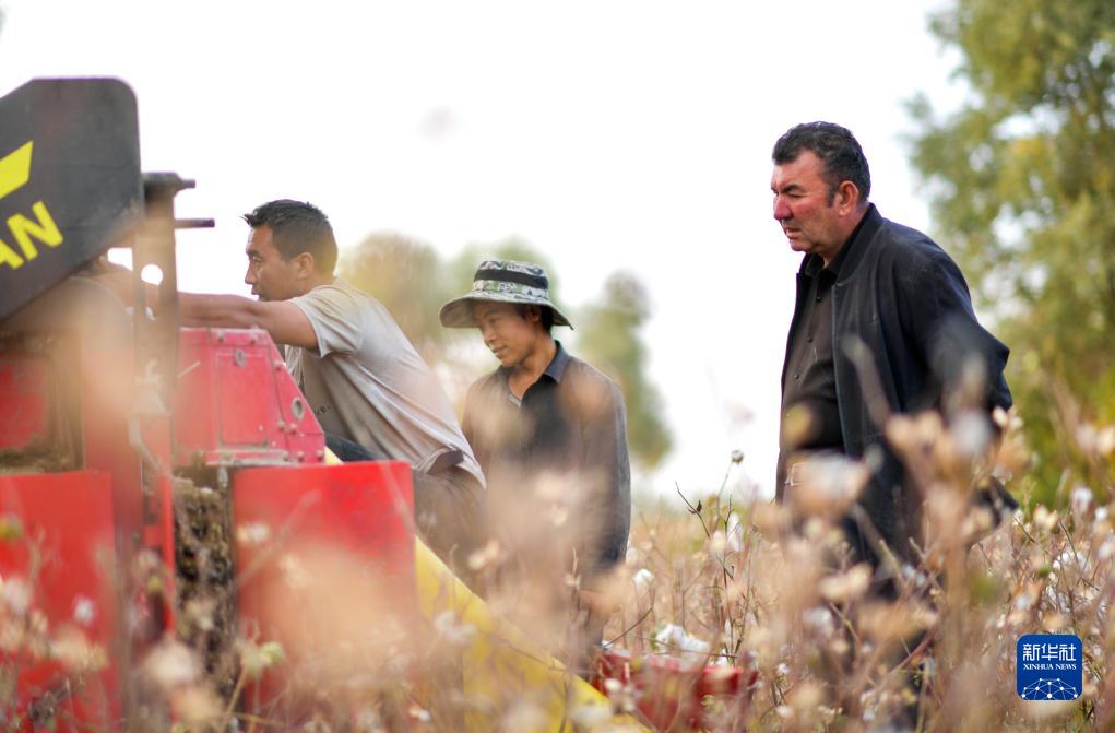 在新疆尉犁縣巴西買(mǎi)里村,爾肯在自家的棉田中查看采棉機(10月20日攝)。