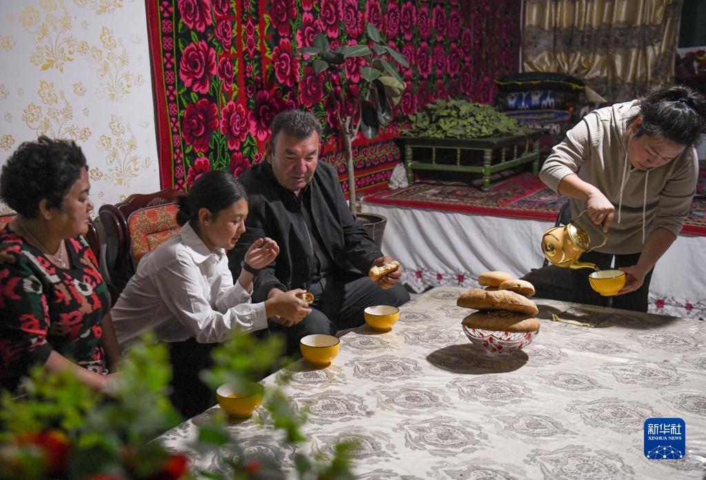 在新疆尉犁縣巴西買(mǎi)里村,爾肯(左三)和家人在家中準備吃晚飯(10月20日攝)。