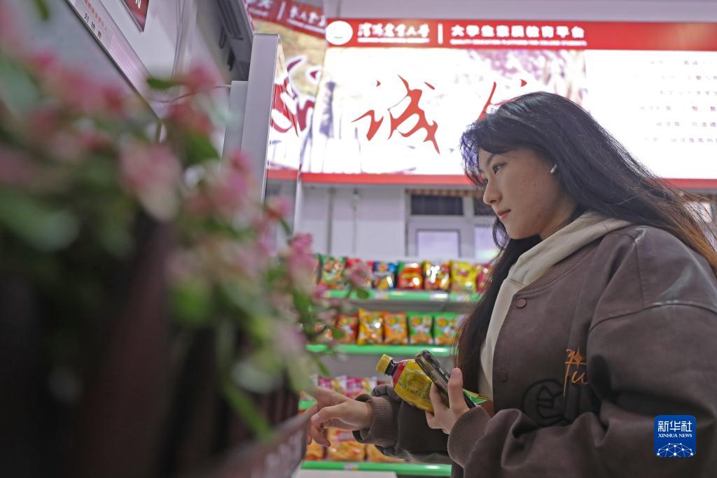 10月19日,在沈陽(yáng)農業(yè)大學(xué)五食堂,學(xué)生在無(wú)人值守的誠信超市內購物掃碼結算。