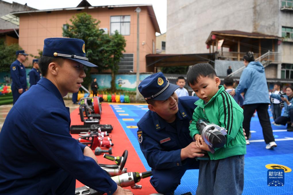 11月9日,在貴州省遵義市余慶縣白泥鎮下里幼兒園,小朋友體驗使用消防救援器材。